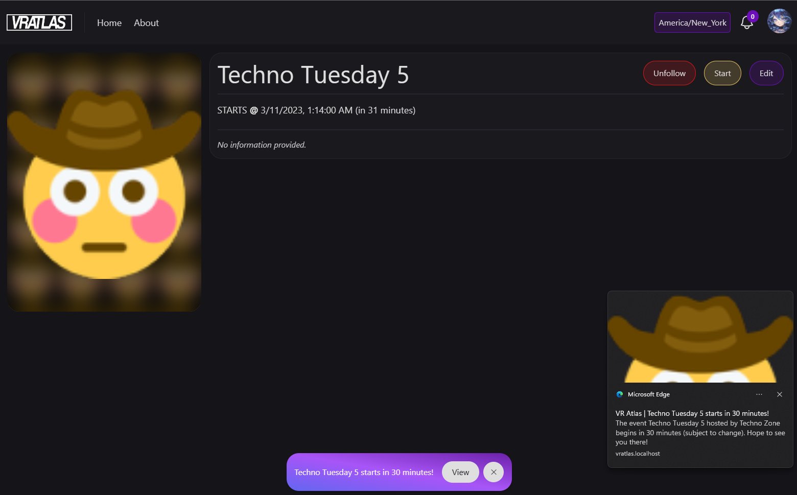 VR Atlas contains a notification system which notifies users of entities they follow. If you're logged in, you will have the ability to follow events, groups, and other users.